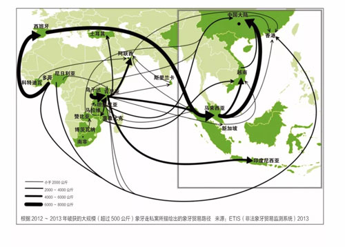 国际野生物贸易研究组织(TRAFFIC)的监测显示:从2009年到2014年,非法象牙经欧洲或东南亚中转,最终到达中国。同时,一些赴非洲的中国公司务工人员、旅游者和当地华人华侨在非洲购买象牙,也因此经常有人在非洲出海关或中国入关时候被截获。