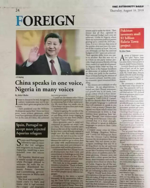 16日,尼日利亚主流媒体《权威报》(Authority)记者奥凯凯在该报发表评论文章,畅谈近期访华感想,高度评价中国发展成就,呼吁尼日利亚借鉴中国经验模式,认真对待中非合作论坛和“一带一路”倡议。