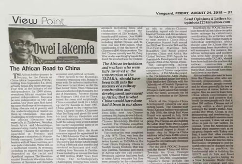 24日,尼日利亚主流媒体《先锋报》(Vanguard)刊登尼知名专栏作家拉克姆法评论文章,回顾非中友好合作历史佳话和成就,热切展望即将举行的中非合作论坛北京峰会,呼吁非洲向中国学习治国理政经验。8月22日,尼总统“媒体支持团队”纸媒负责人丘库迪在《太阳报》(Daily Sun)发表评论文章,呼吁非中、尼中加强发展战略对接,扩大共识、增进合作。