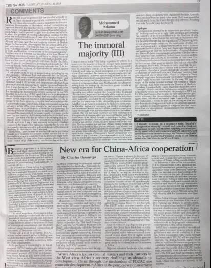 8月30日,尼日利亚主流媒体《国民报》(The Nation)评论专栏发表尼日利亚中国研究中心主任查尔斯·奥努奈居(Charles Onunaiju)撰写的“中非合作迎来新时代”文章,高度评价中非合作论坛成就和意义。