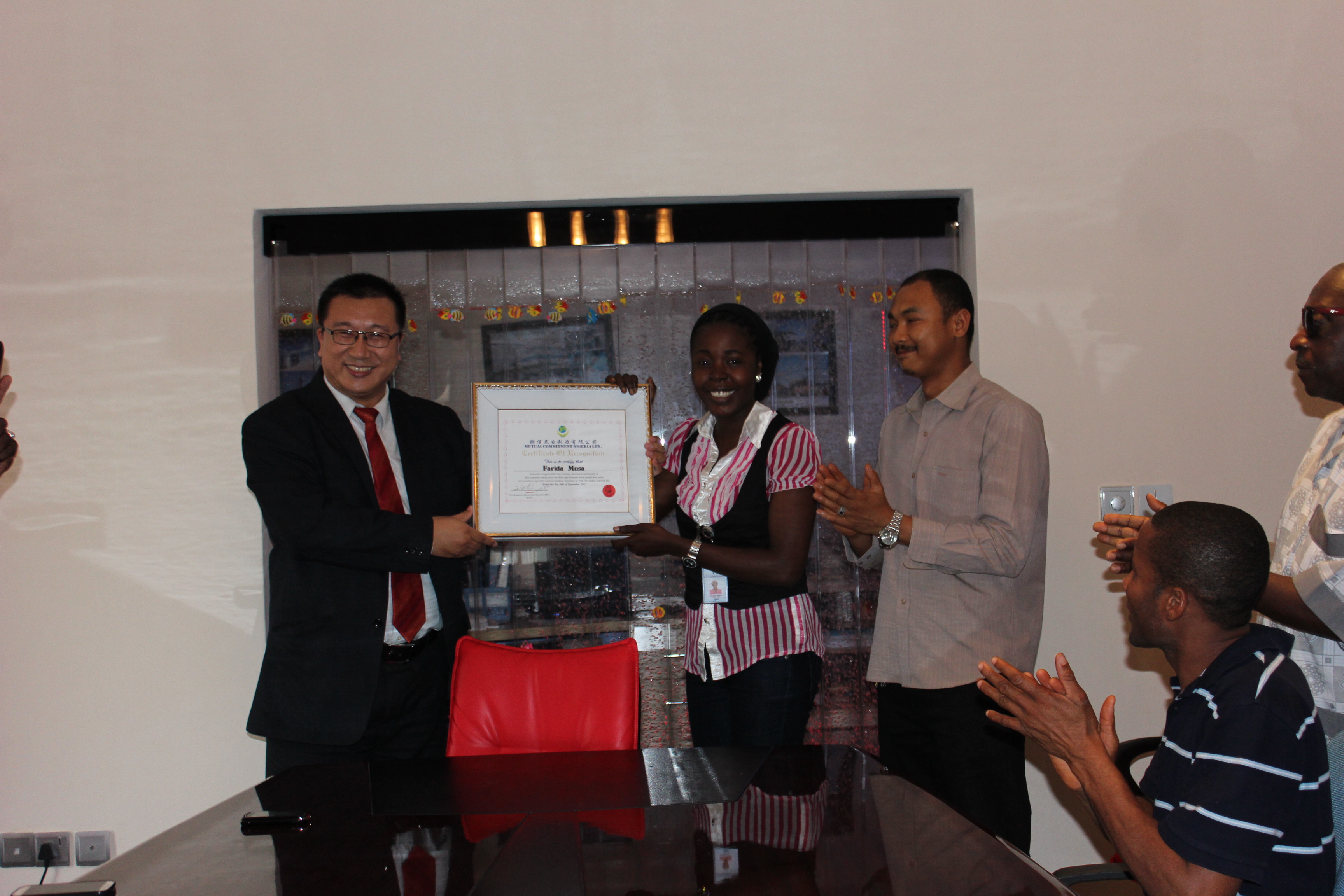The Managing Director (MD) and all members of the Group, in Nigeria attend wedding of the excellent staff Farida Musa Garba & her fiancé Abubakar T. Garba. Executive Director (ED), Mr. Charles on behalf of the company awards a certification to Farida Musa Garba to commemorate the happy moment. Managing Director (MD), Mr. Long gives a financial incentive to the beautiful bride, which is 250,000 Naira for her hard working and loyalty to the company. MD wishes her and her fiancé to build a warm and happy family, so that can give the strong support to both good life and good career.