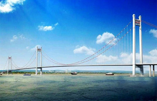 The bridge over the left branch is a suspension bridge with three towers that spans 1,080meters. This section is tied with the Taizhou Yangtze River Bridge as the longest doublespan suspension bridge in the world. The bridge over the right branch is a cable-stayed bridge with three towers that spans 260 meters.