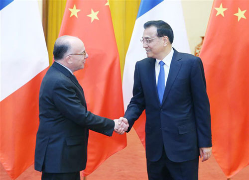 Chinese Premier Li Keqiang (R) shakes hands with French Prime Minister Bernard Cazeneuve in Beijing, capital of China, Feb. 21, 2017.