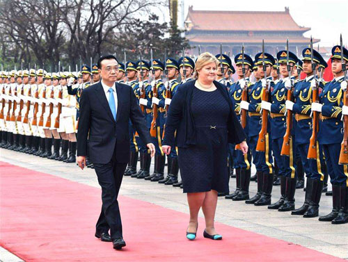 Chinese Premier Li Keqiang and Solberg held talks and witnessed the signing of cooperation documents ranging from the resumption of a free trade agreement negotiations, and science and technology, to sports and health.