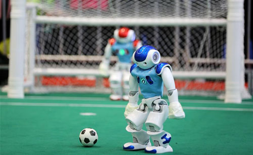 Robots take part in a soccer match during the 2017 RoboCup in Rizhao, east China's Shandong Province, April 2, 2017. The 2017 RoboCup attracted 418 teams around China.