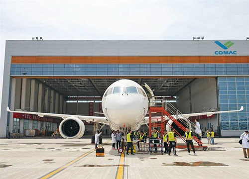 A C919 aircraft is seen outside a hangar at the manufacturing base of Commercial Aircraft Corp of China in Shanghai. The country's homegrown passenger jet is likely to receive airworthiness certification from the European regulator, a key step to enter the Western market.