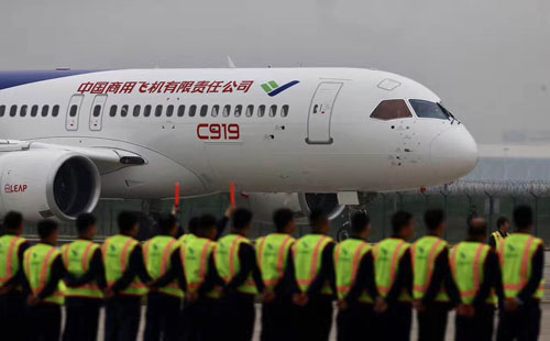 China's homegrown large passenger plane, the C919, took to the skies on Friday in the eastern city of Shanghai, marking a great improvement of China's innovative capability and high technology in aviation and aerospace industry.