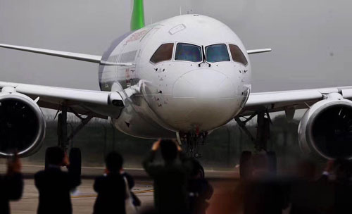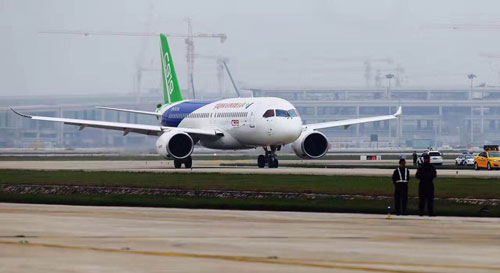 Departing from Shanghai Pudong International Airport at around 2 pm (0700GMT) with five crew members on board but no passengers, the twin-engine plane signals the country's entry into the global aviation market as a strong competitor.