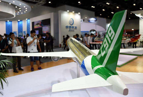 Visitors view a model of the homegrown large passenger plane C919 during the Aviation Expo China 2017 in Beijing, capital of China, Sept. 19, 2017. The expo is held from Sept. 19 to 22.