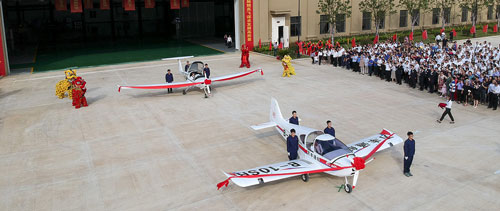 A launch ceremony for new airplanes is held in Xinchang, Zhejiang province, on Sept 25, 2018. Two small planes, including a Diamond's DA20 fixed-wing and an Alto sport aircraft, were displayed at the ceremony.