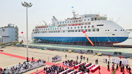 The first China-made cruise ship for polar expeditions tested the water in east China's Jiangsu Province.