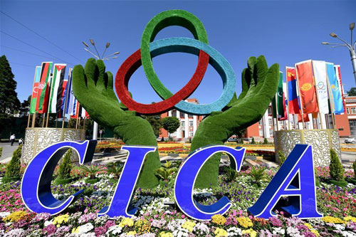 The logo of the fifth summit of the Conference on Interaction and Confidence Building Measures in Asia (CICA) is seen in Tajikistan's capital Dushanbe, June 13, 2019.