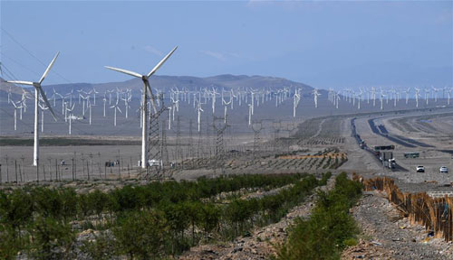 Photo shows a wind power field in the countryside of Turpan, northwest China's Xinjiang Uygur Autonomous Region.