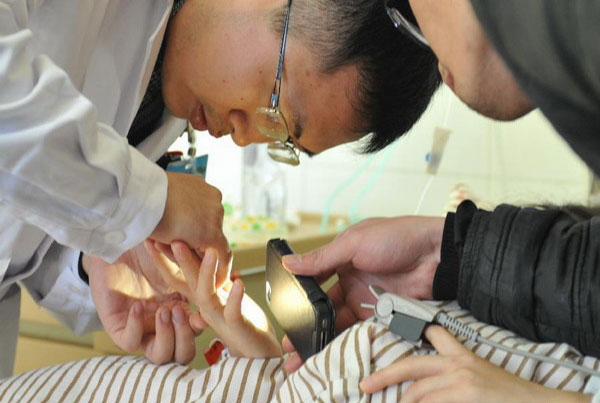 A doctor removes glass from a victim's hand who is injured of a bus fire, Jan 15, 2015