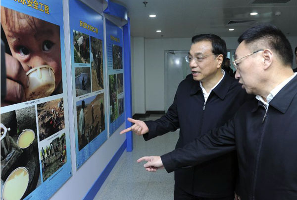 Chinese Premier Li Keqiang views a poster of rural drinking water safety project during his visit to the Ministry of Water Resources in Beijing, capital of China, Nov. 24, 2014. Li Keqiang made an inspection tour of the Ministry of Water Resources in Beijing on Monday.
