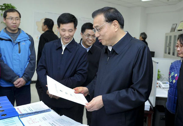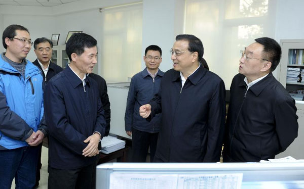 Chinese Premier Li Keqiang asks about the task of rural drinking water safety during his visit to the Ministry of Water Resources in Beijing, capital of China, Nov. 24, 2014. Li Keqiang made an inspection tour of the Ministry of Water Resources in Beijing on Monday.