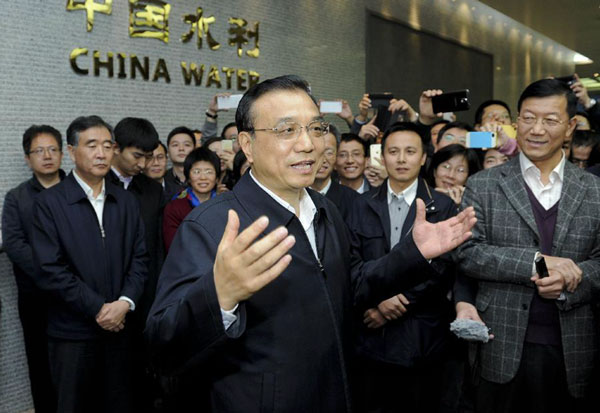 Chinese Premier Li Keqiang talks with staffs during his visit to the Ministry of Water Resources in Beijing, capital of China, Nov. 24, 2014. Li Keqiang made an inspection tour of the Ministry of Water Resources in Beijing on Monday.