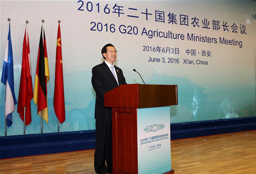 Chinese Minister of Agriculture Han Changfu addresses the G20 Agriculture Ministers Meeting in Xi'an, northwest China's Shaanxi Province, June 3, 2016.