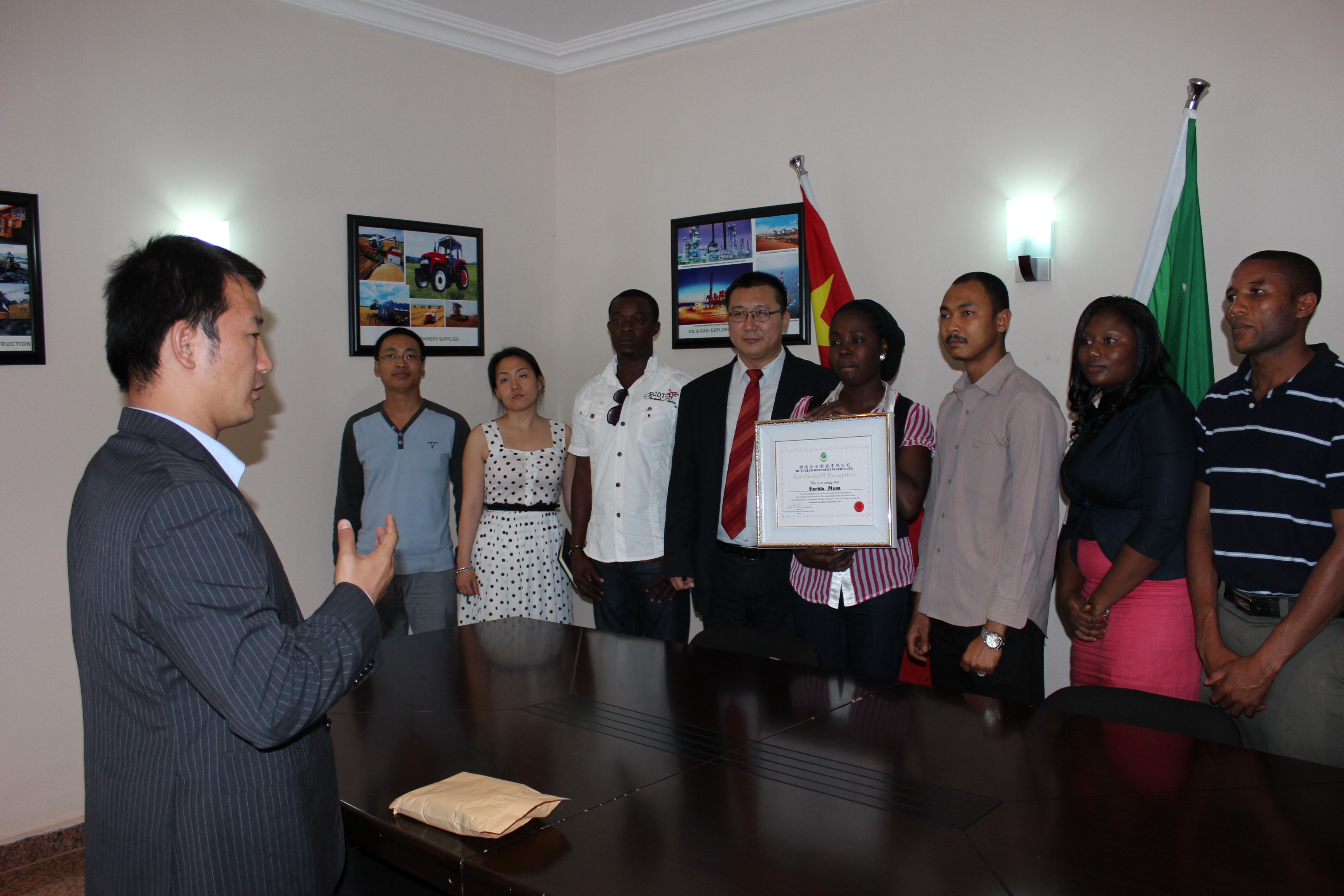 The Managing Director (MD) and all members of the Group, in Nigeria attend wedding of the excellent staff Farida Musa Garba & her fiancé Abubakar T. Garba. Executive Director (ED), Mr. Charles on behalf of the company awards a certification to Farida Musa Garba to commemorate the happy moment. Managing Director (MD), Mr. Long gives a financial incentive to the beautiful bride, which is 250,000 Naira for her hard working and loyalty to the company. MD wishes her and her fiancé to build a warm and happy family, so that can give the strong support to both good life and good career.
