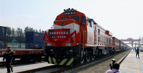 The train, which was loaded with building materials and other commodities, left Jiuyuan Logistics Park in Baotou City Wednesday morning. The 4, 332-km trip to Astana, capital of Kazakhstan, will take eight days.
