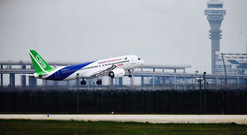Departing from Shanghai Pudong International Airport at around 2 pm (0700GMT) with five crew members on board but no passengers, the twin-engine plane signals the country's entry into the global aviation market as a strong competitor.
